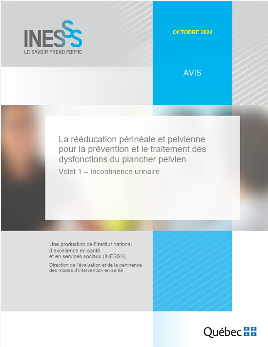 Roberge S, …. Dumoulin C, et al. (2022). Avis La rééducation périnéale et pelvienne pour la prévention et le traitement des dysfonctions du plancher pelvien Volet 1 : incontinence urinaire [Perineal and pelvic rehabilitation for the prevention and treatment of pelvic floor dysfunctions – Part 1: Urinary incontinence]. Publication of the Institut national d’excellence en santé et en services sociaux (INESSS) - Direction de l’évaluation et de la pertinence des modes d’intervention en santé. 112 pages. English summary available: https://www.inesss.qc.ca/fileadmin/doc/INESSS/Rapports/OrganisationsSoins/INESSS_REPP_IU_volet_1_Summary.pdf
