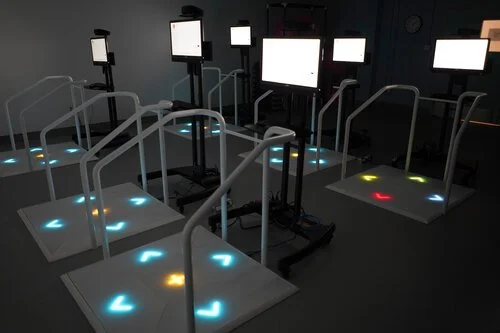 2. Dividat's Senso© platform is a training system consisting of interactive games that improve users’ physical and cognitive functions. The platform is equipped with sensors that measure and record various strength and balance parameters of the lower limbs during the games.